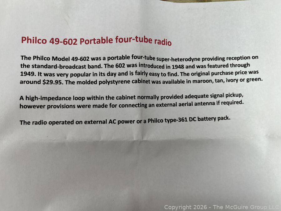 Lot #0136MB: Philco Transitone Model 49-602 AM Four Tube Portable Radio