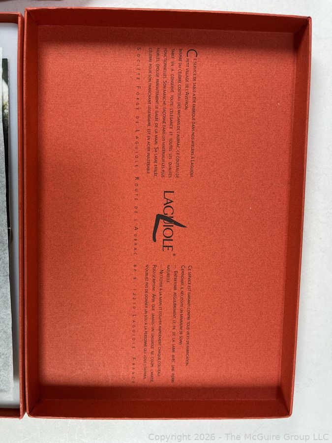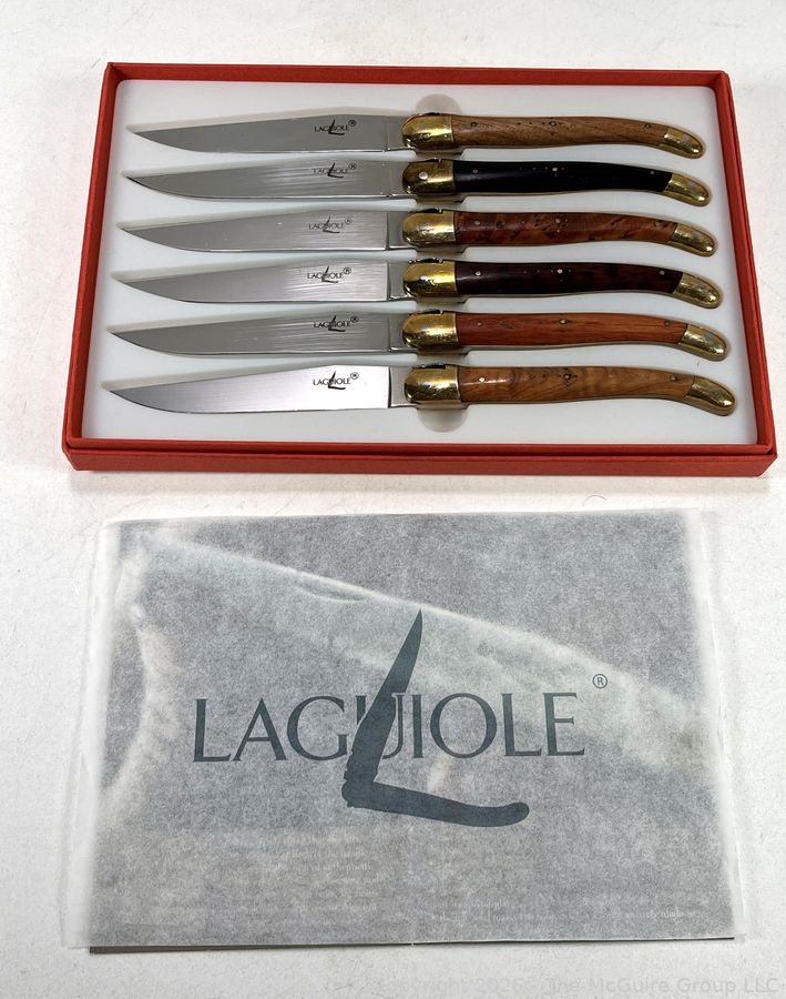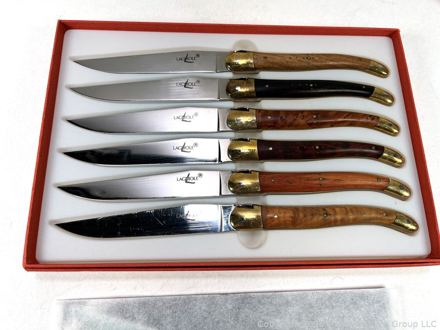 Lot #0035PB: Set of Six (6) Laguiole Steak Knives by Goyon-Chazeau Mixed Wood in Box