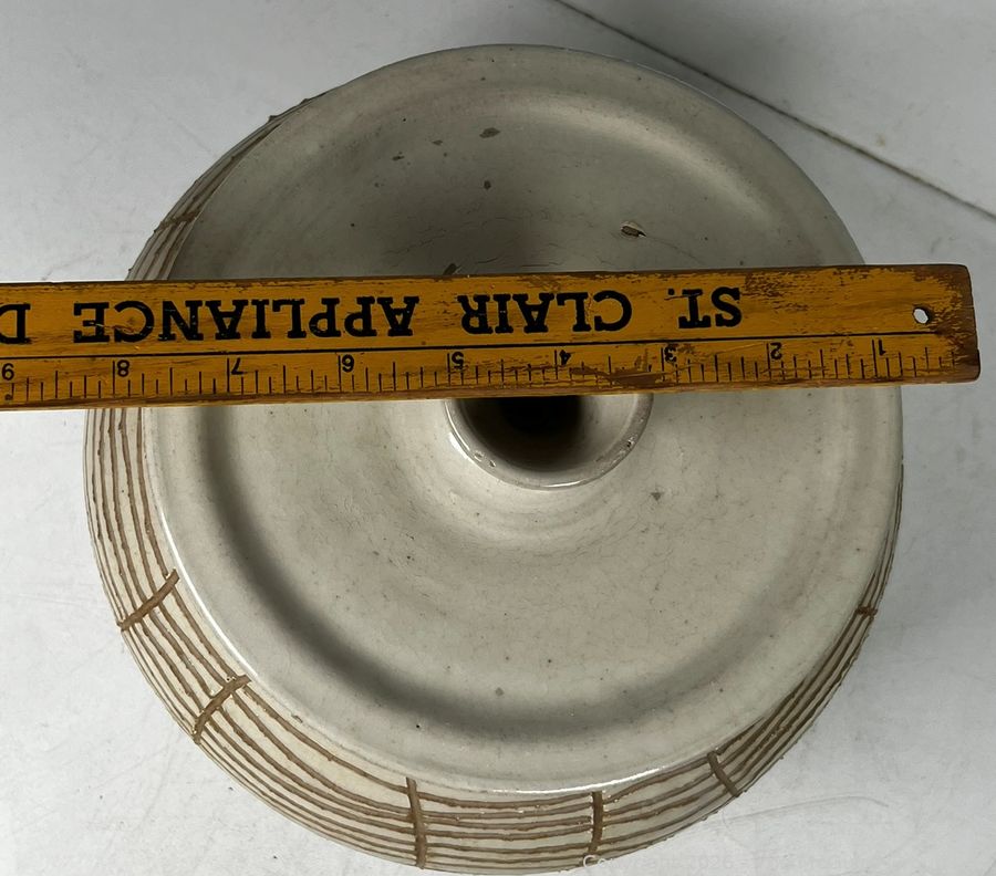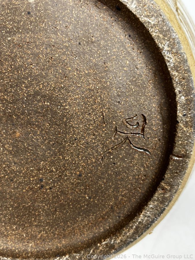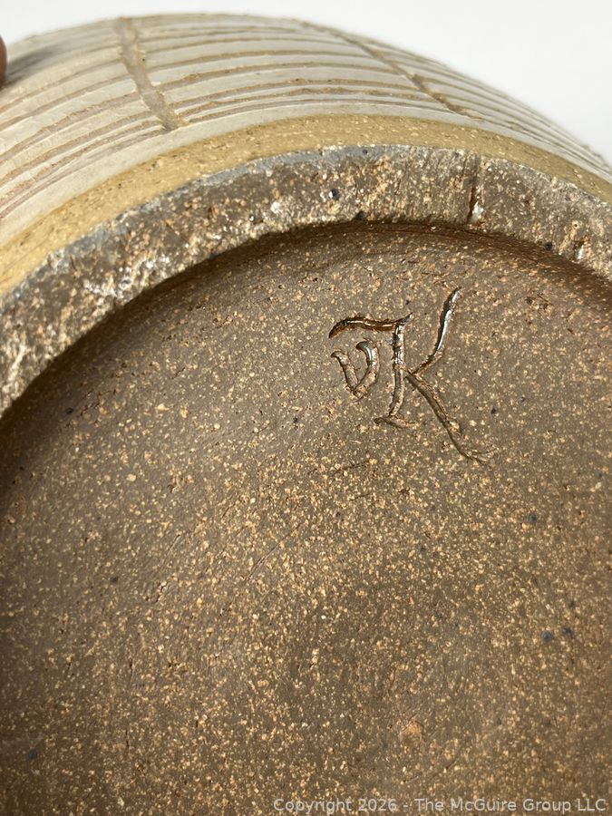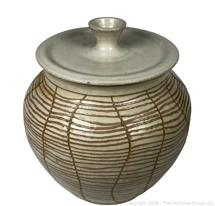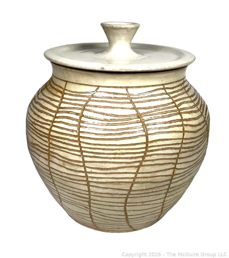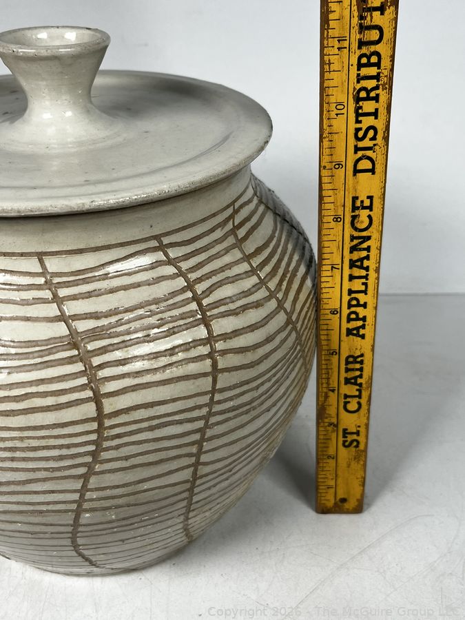 Lot #0445: Studio Made Striped Pottery Jar with Lid, Signed by Artist. 12" tall