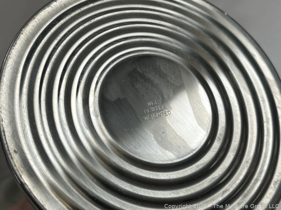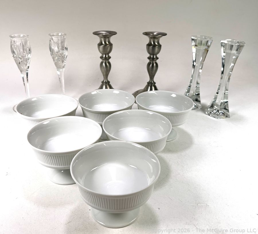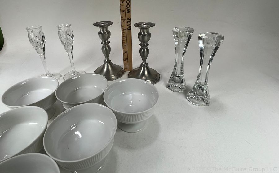 Lot #1000PB: Three (3) Sets of Crystal and Pewter Candlesticks and Six (6) Footed Ceramic Compote Dishes
