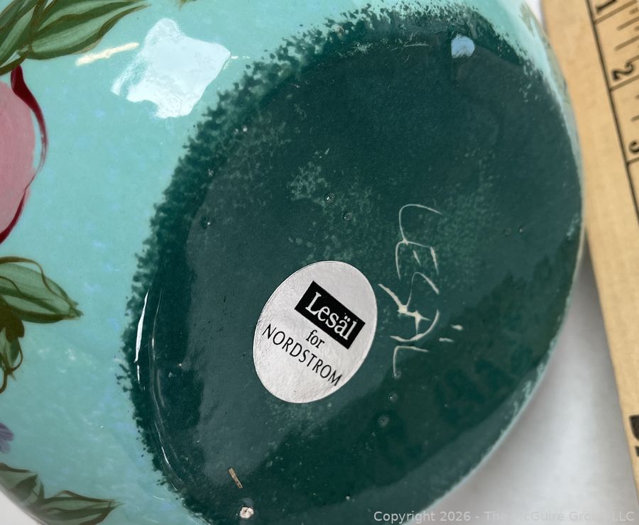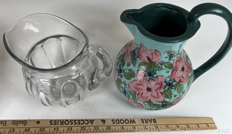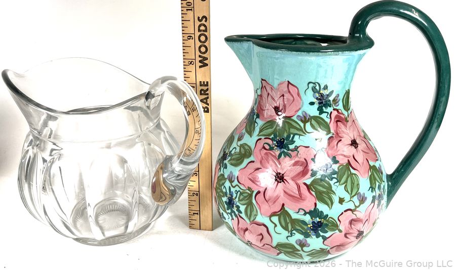 Lot #0115PB: Two (2) Pitchers in Clear Glass Crystal and Floral Painted Pottery