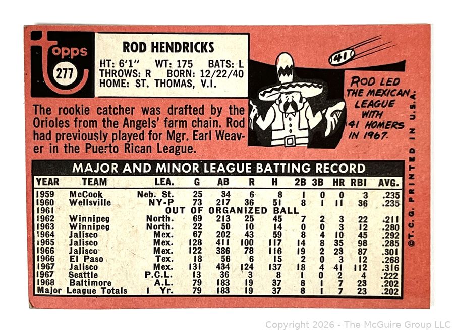 Lot #0308CM: 1969 Topps #277 Rod Hendricks Baltimore Orioles Baseball Card