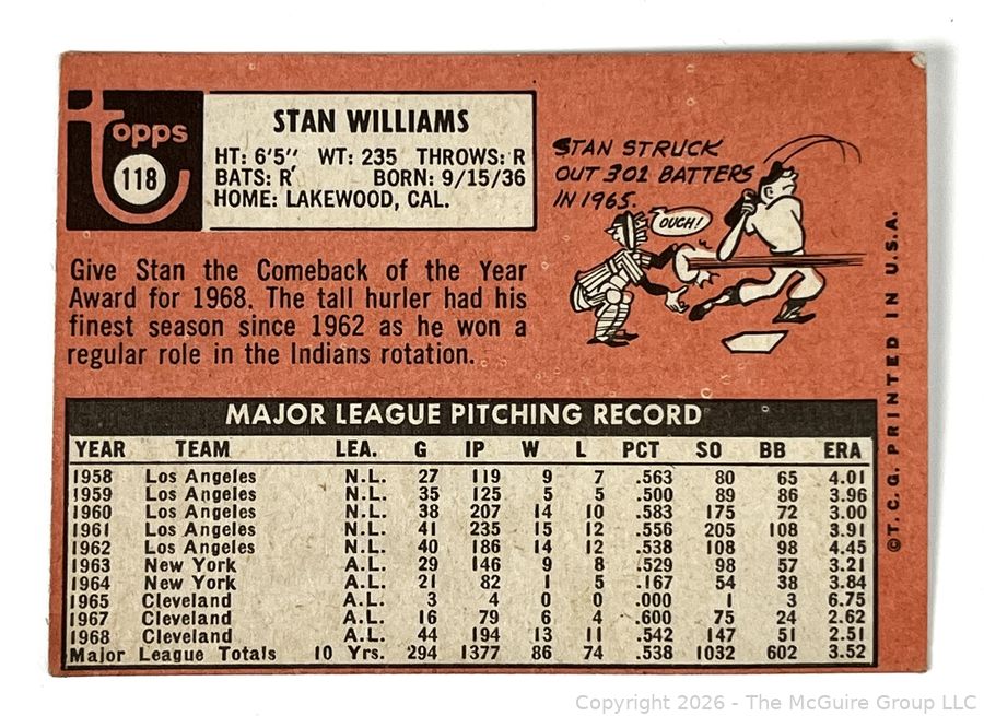 Lot #0223CM: 1969 Topps Baseball #118 Stan Williams Cleveland Indians Baseball Card