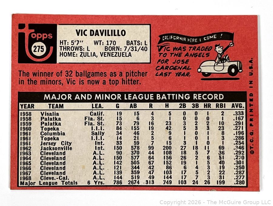 Lot #0213CM: 1969 Topps Baseball #275 Vic Davalillo Angels Baseball Card