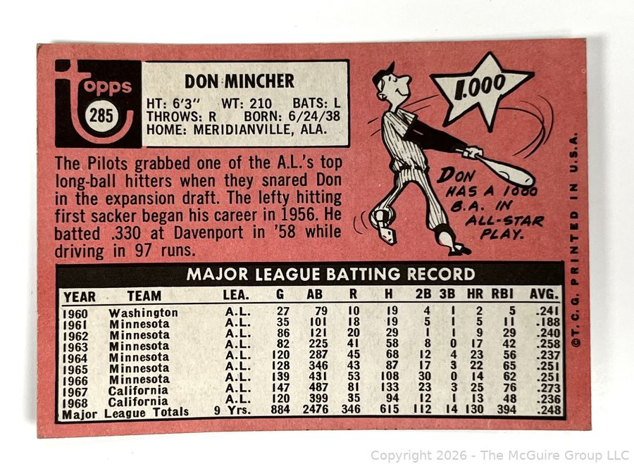 Lot #0197CM: 1969 Topps Baseball #285 Don Mincher Pilots Baseball Card