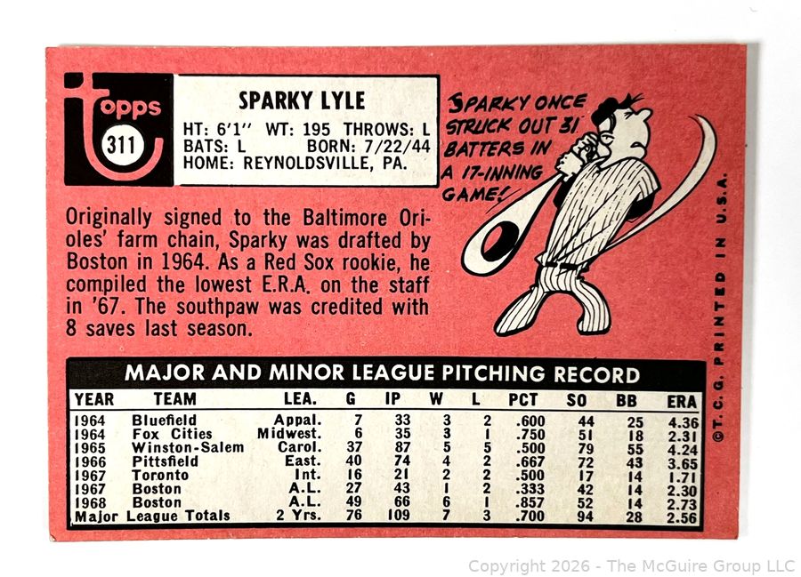Lot #0202CM: 1969 Topps Sparky Lyle Boston Red Sox Card #311 Baseball Card