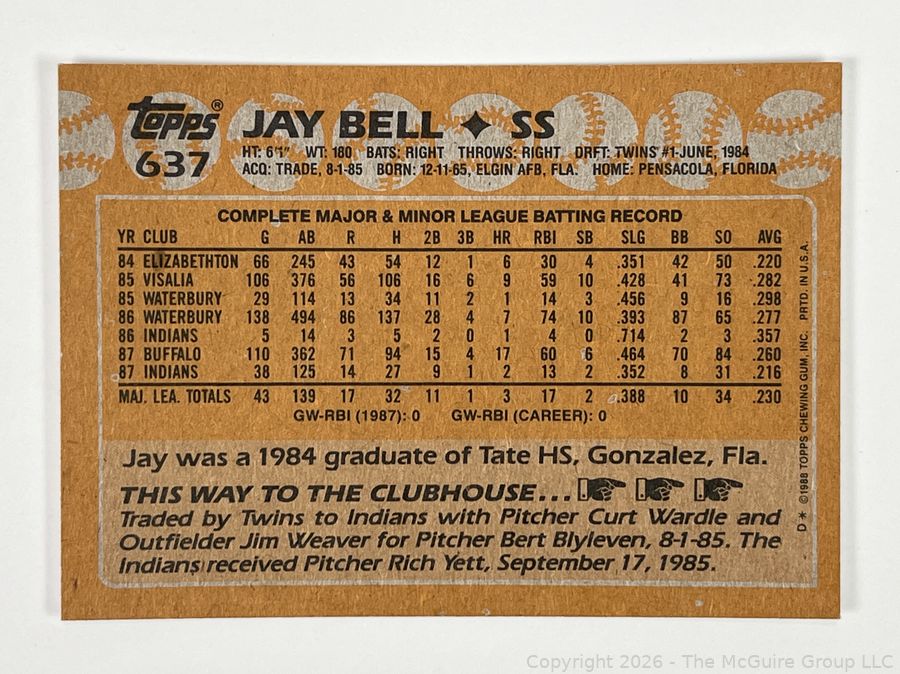 Lot #0259CM: 1988 Jay Bell Tops Baseball Card. Indians