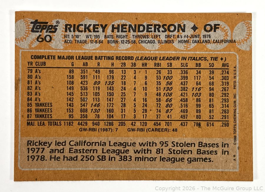 Lot #0037CM: 1988 Rickey Henderson Topps Baseball Card. Yankees