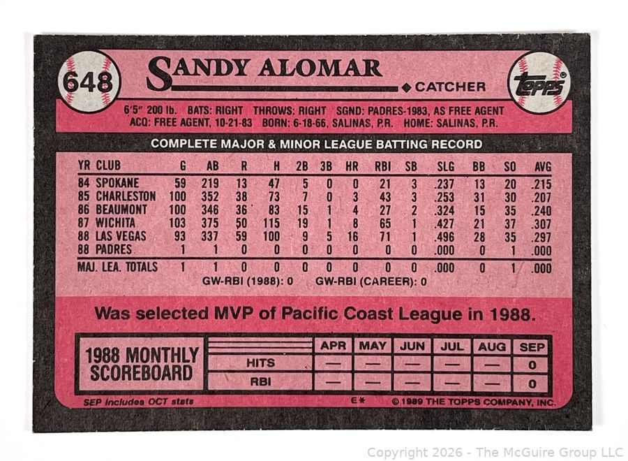 Lot #0119CM: 1989 Sandy Alomar Topps Baseball Card. Padres
