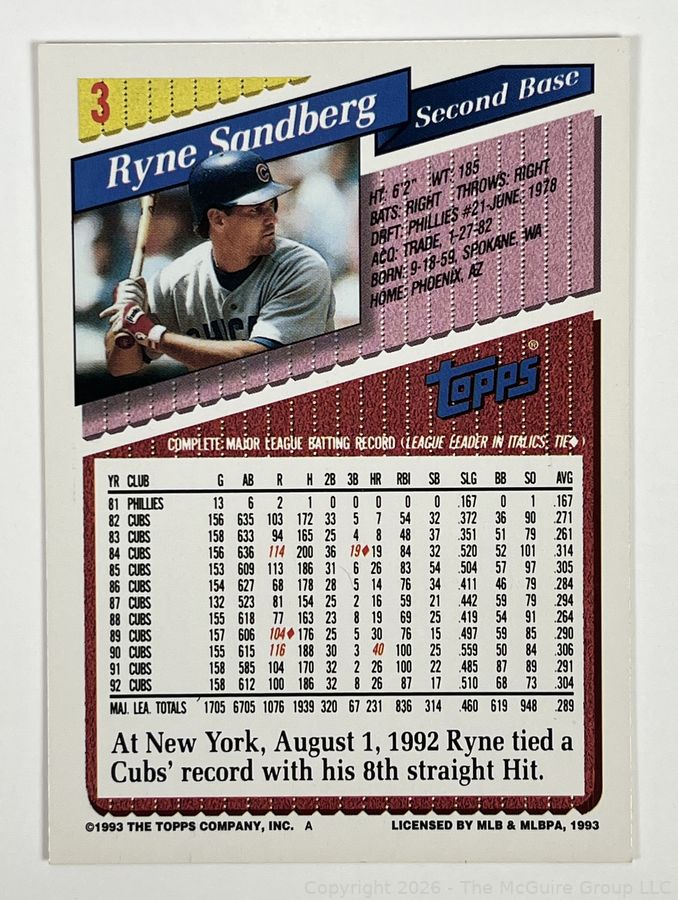 Lot #0173CM: 1993 Ryne Sandberg Topps Baseball Card. Cubs