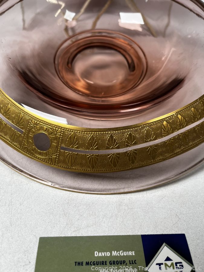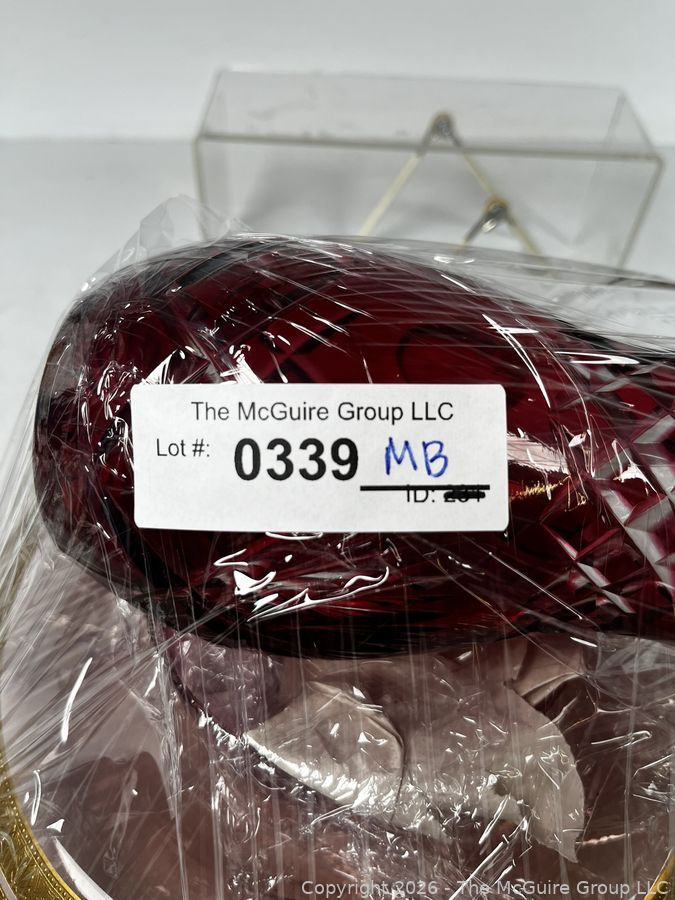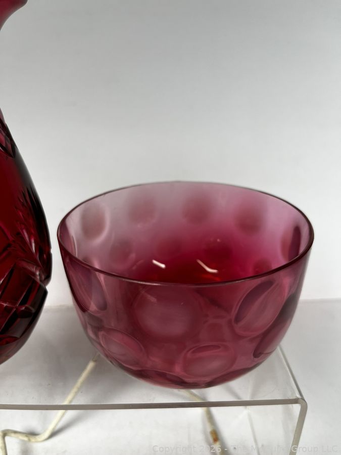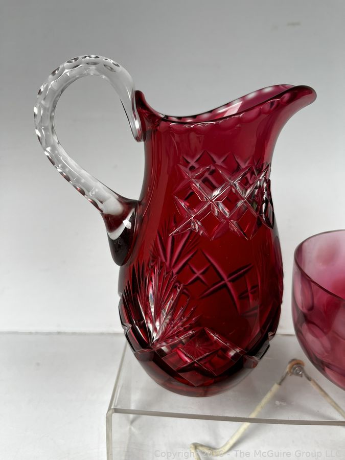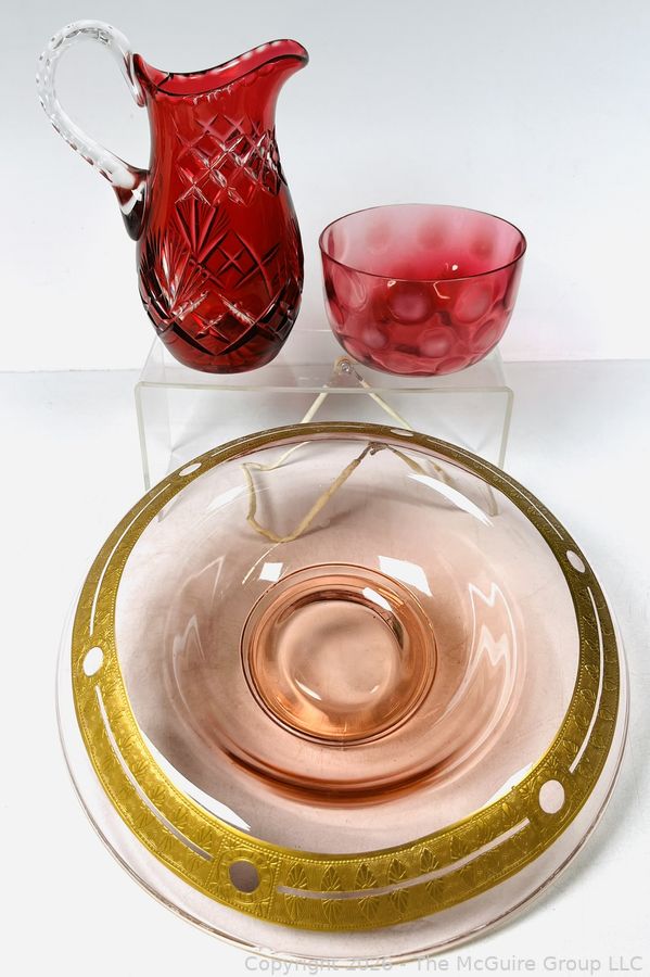Lot #0339MB: Bohemian Ruby Red Cut to Clear Crystal Pitcher, Cranberry Glass Bowl and Pink Depression Glass Console Bowl With Gold Gilt Trim Bowl