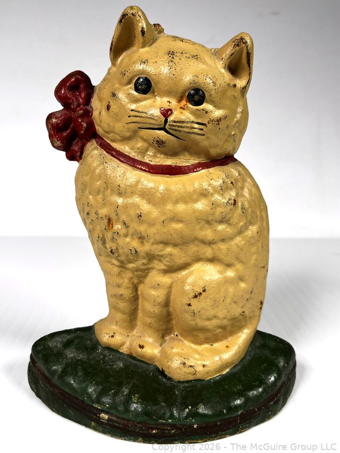 Lot #0305CP: Cast Iron White Cat With Red Ribbon Bow Doorstop