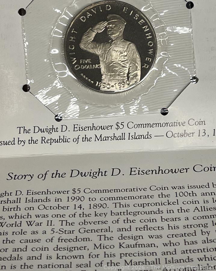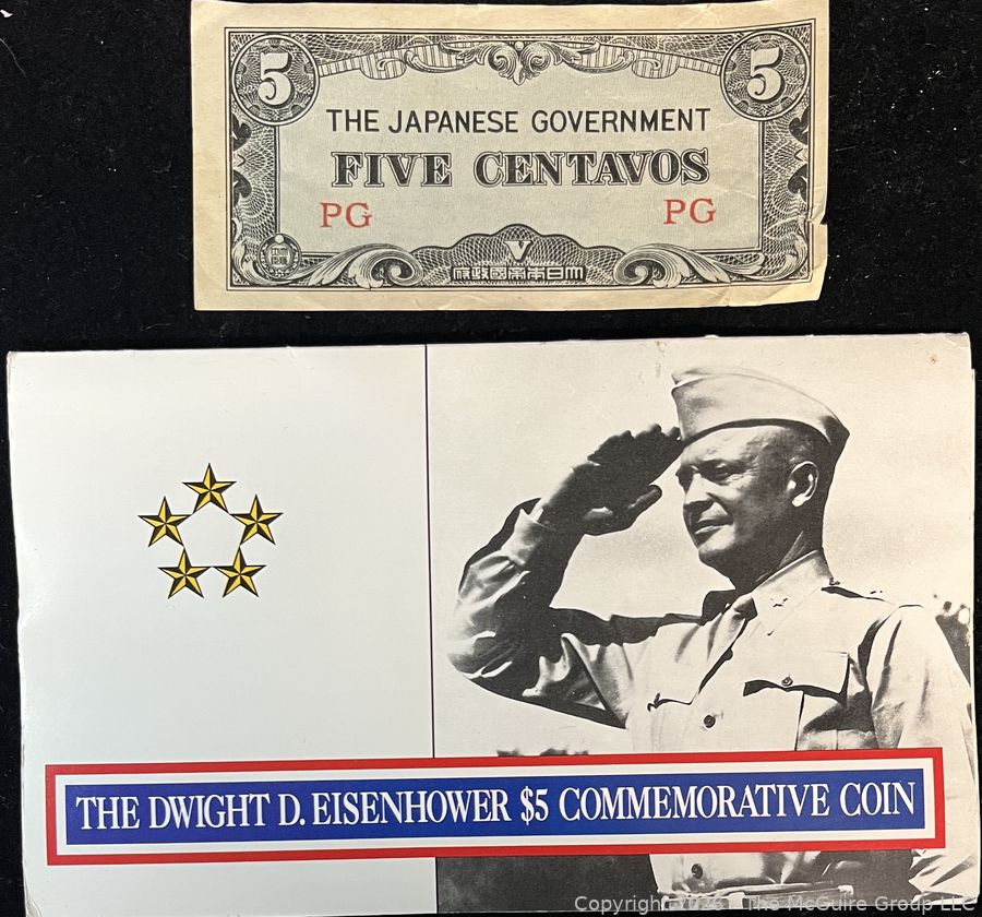 Lot #1009: Dwight D. Eisenhower Commemorative Coin & Japanese Government-Issued Philippine 5 Centavos Banknote.