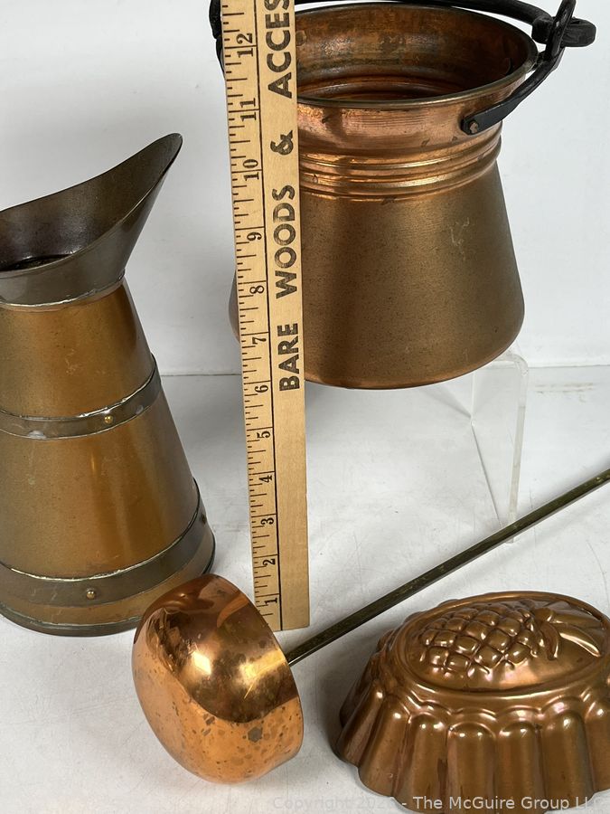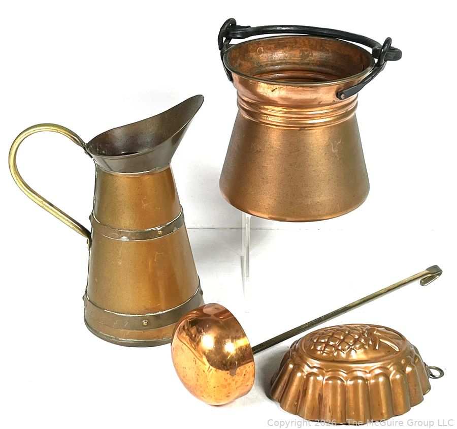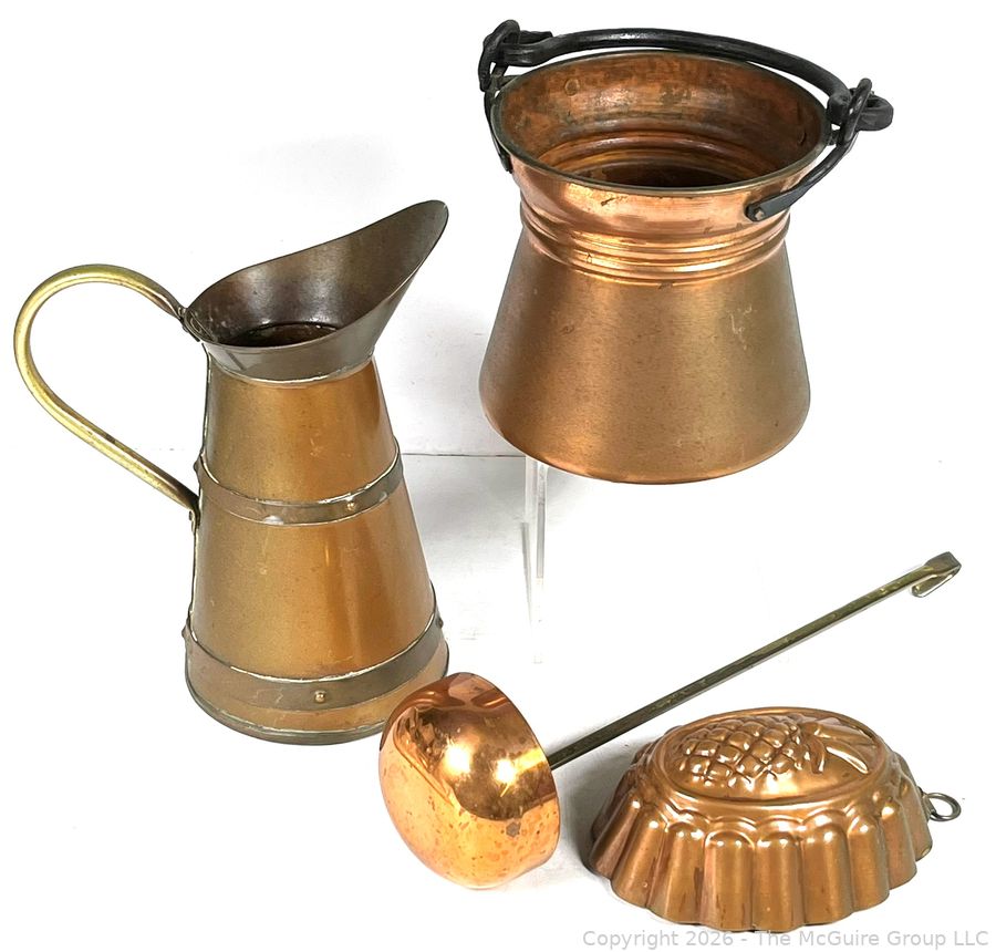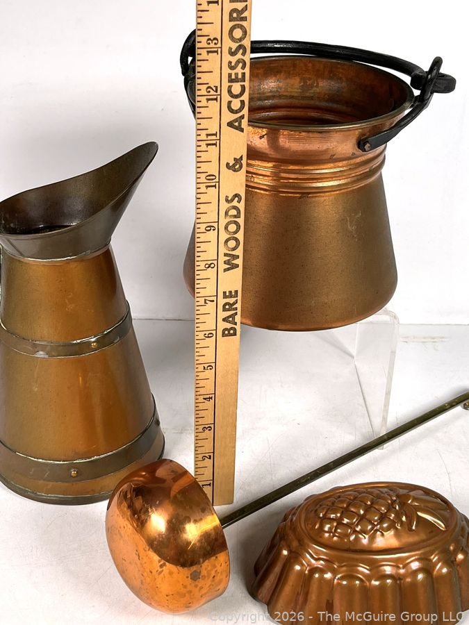 Lot #0296BE: Four (4) Copper Pitchers, Ladle and Mold
