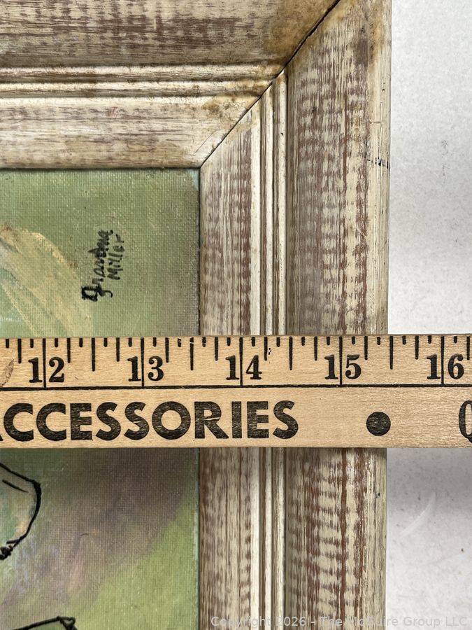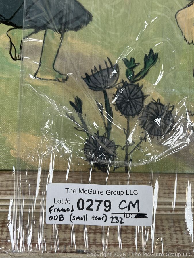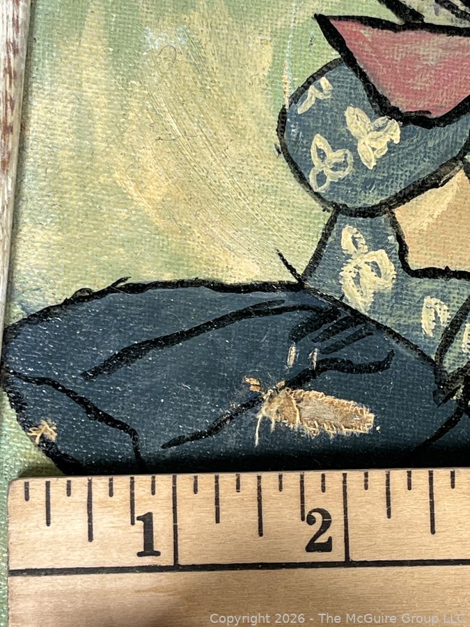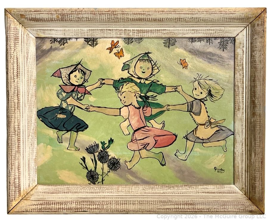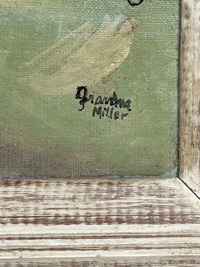 Lot #0279CM: Framed Oil on Board of Children Playing Signed by Grandma Miller. See All Photos For Small Tear