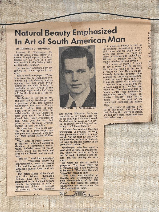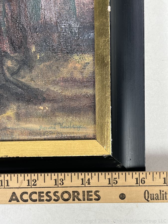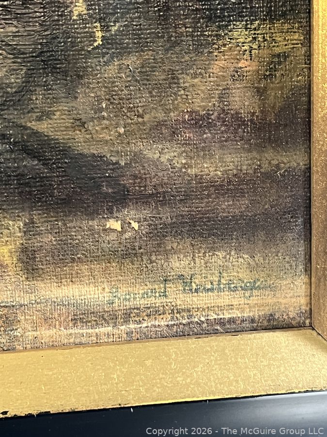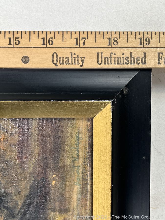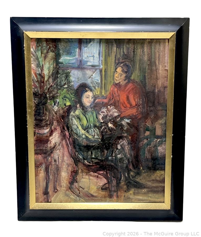 Lot #0273MB: Framed Oil on Canvas Titled Man, Wife & Poodle Signed by Artist Leonard Weisberger, 1968. 16" x 19" with small tear.