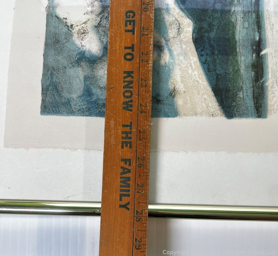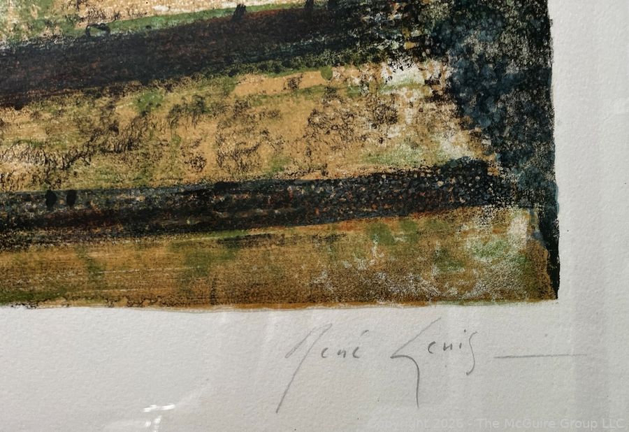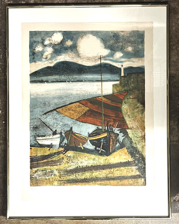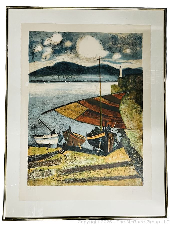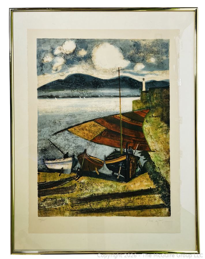 Lot #0075PB: Framed Under Glass Color Lithograph of Fishing Boats at the Beach Signed by Artist Rene Genis. 28" x 36"