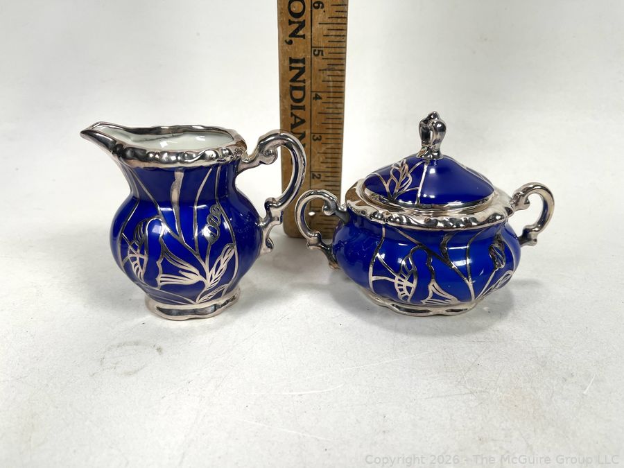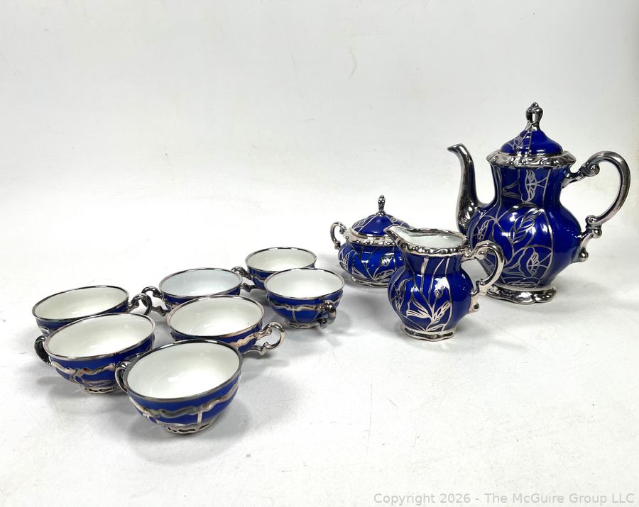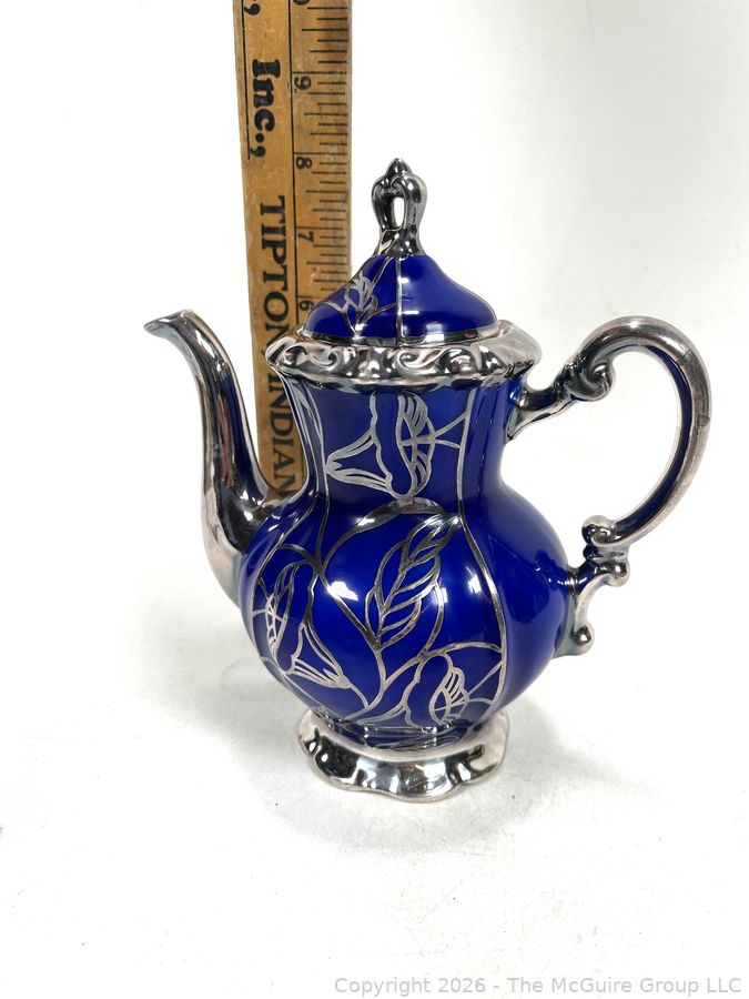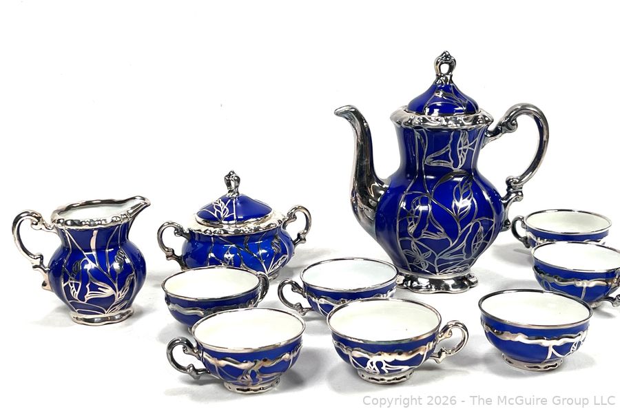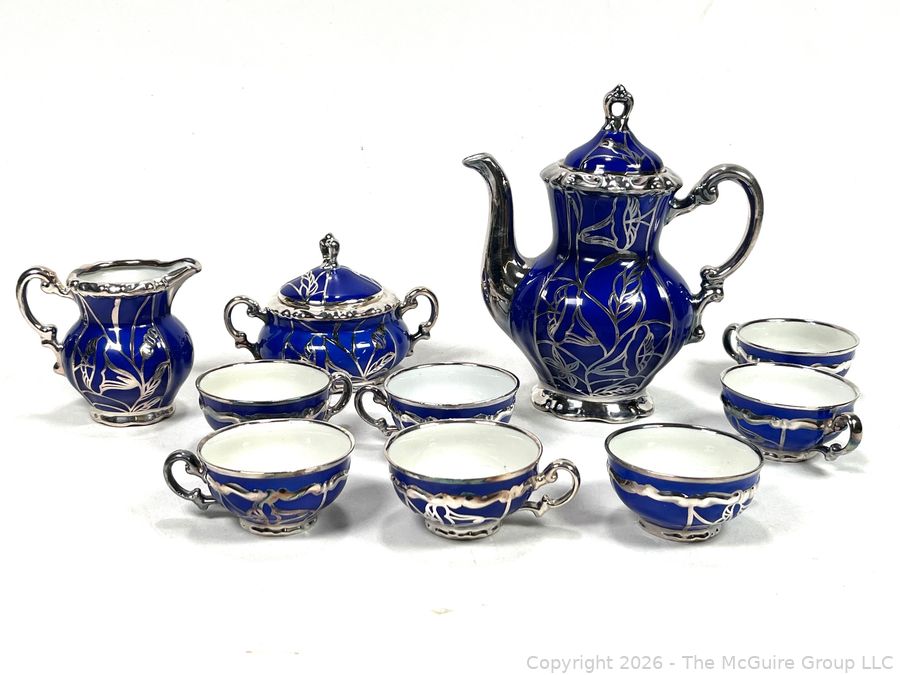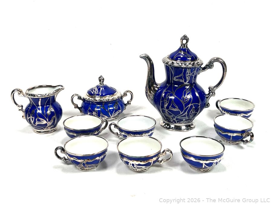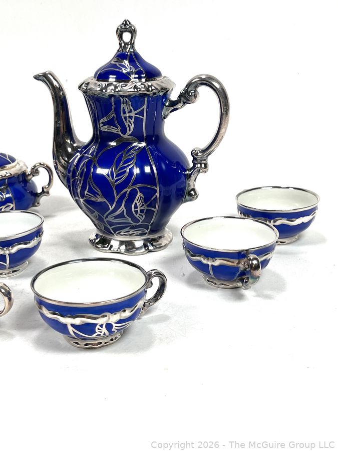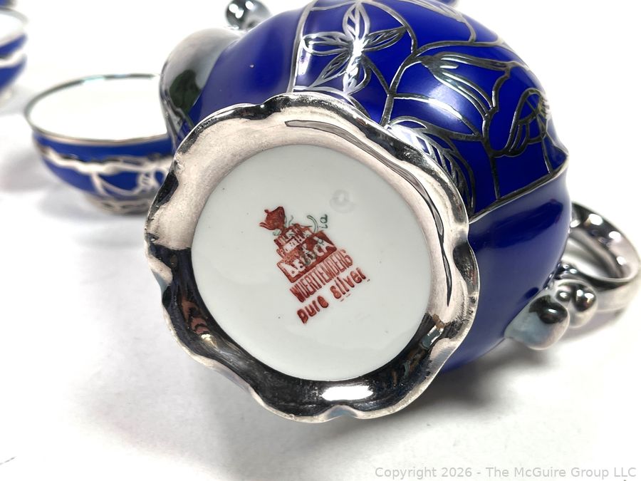 Lot #0003CP: Friedrich Deusch Coffee Set, Cobalt Blue Ground with Pure Silver Overlay. Made in Wurttemberg Germany Early 20th C