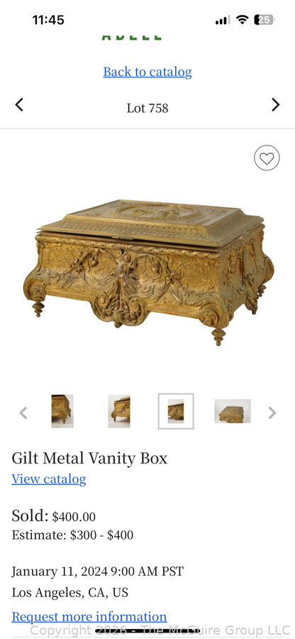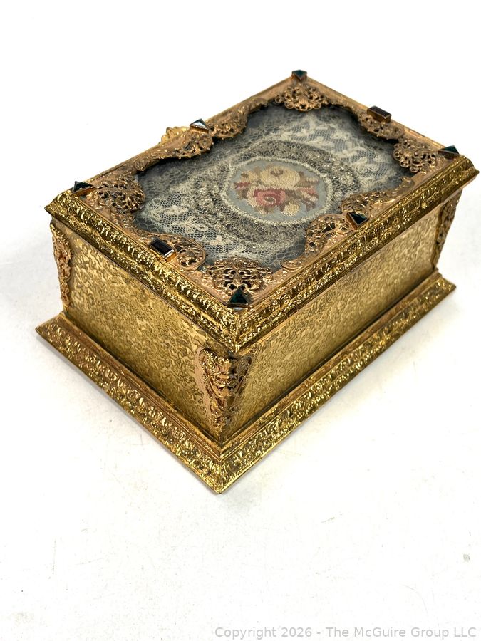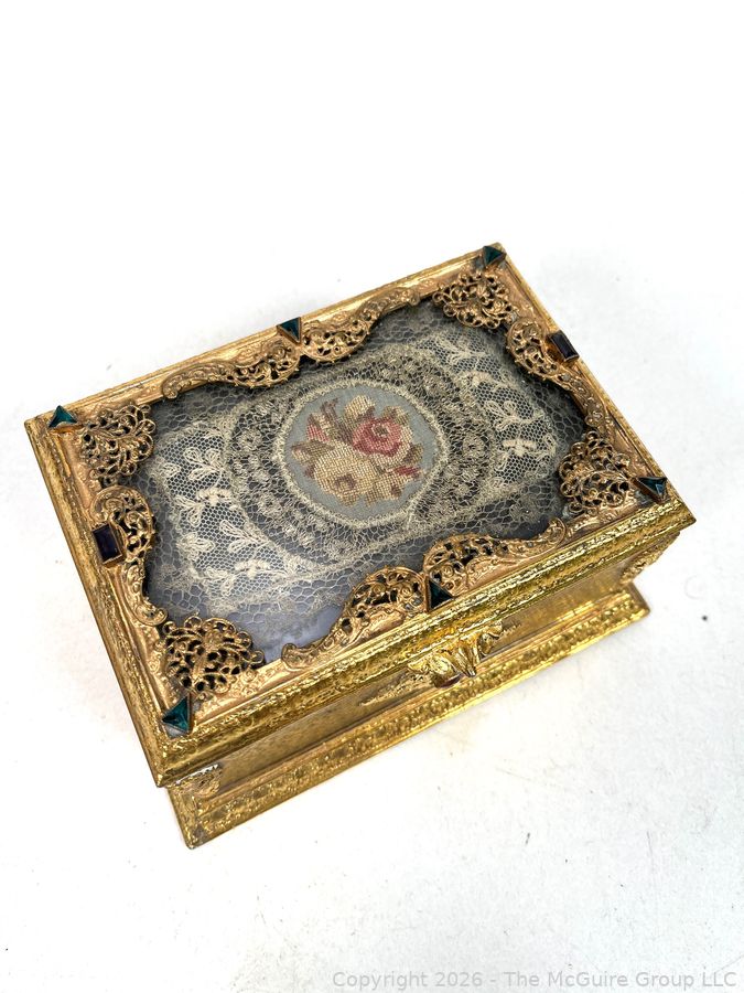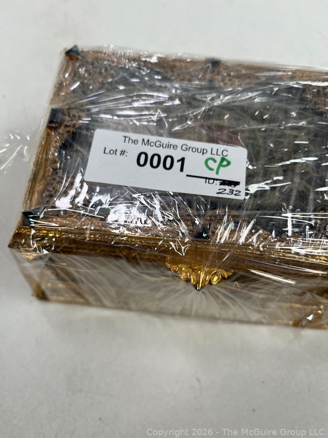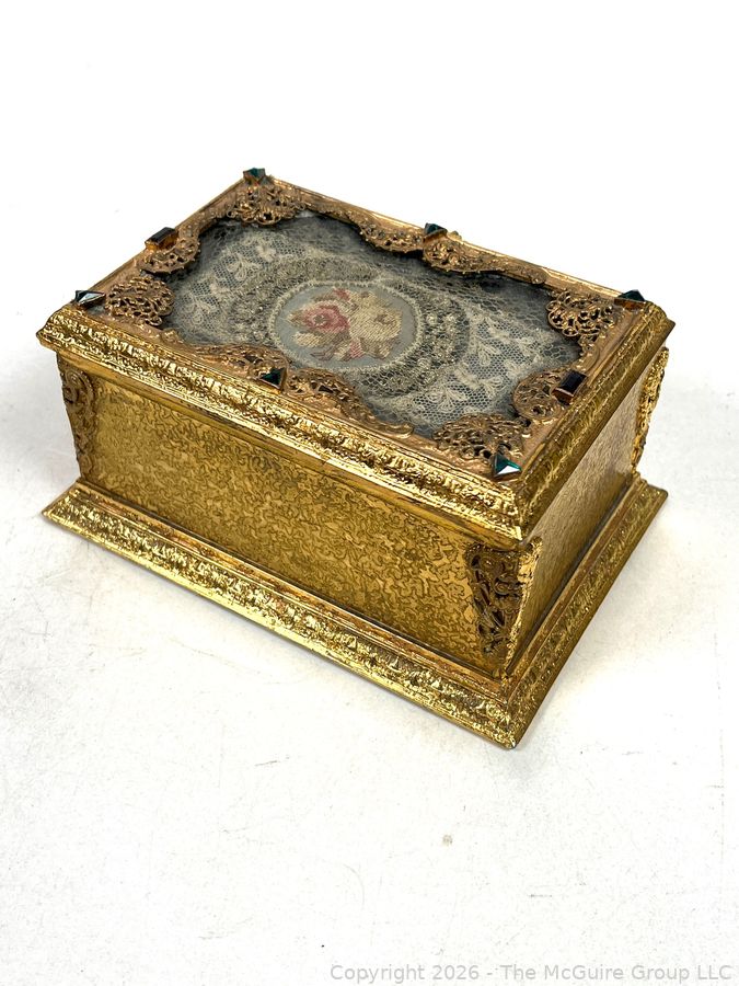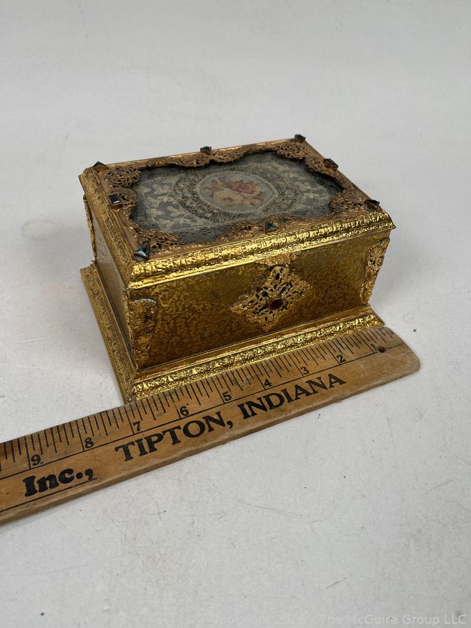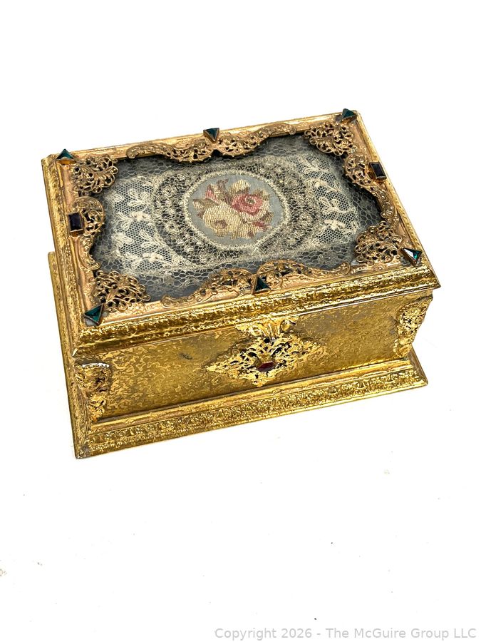 Lot #0001CP: Gilt Metal 19th C French Vanity Box, Ornate High Relief Decoration and Hinged Lid.