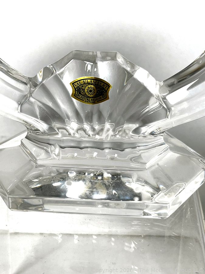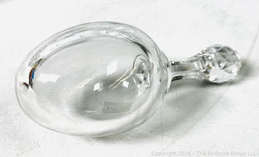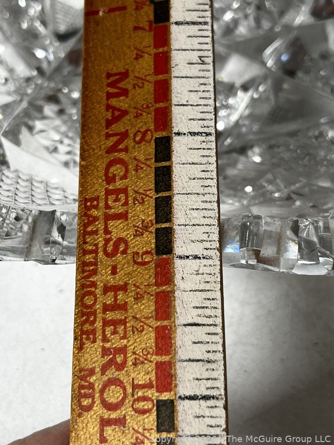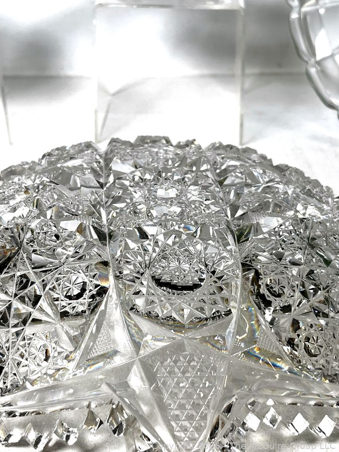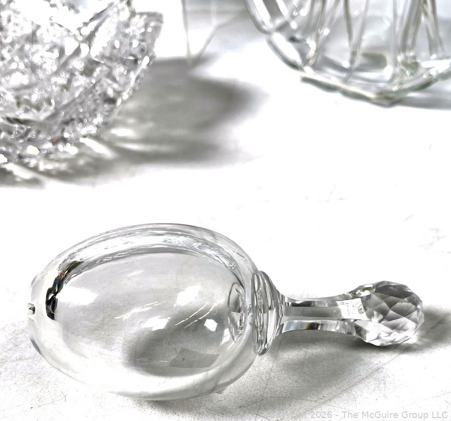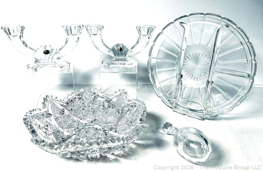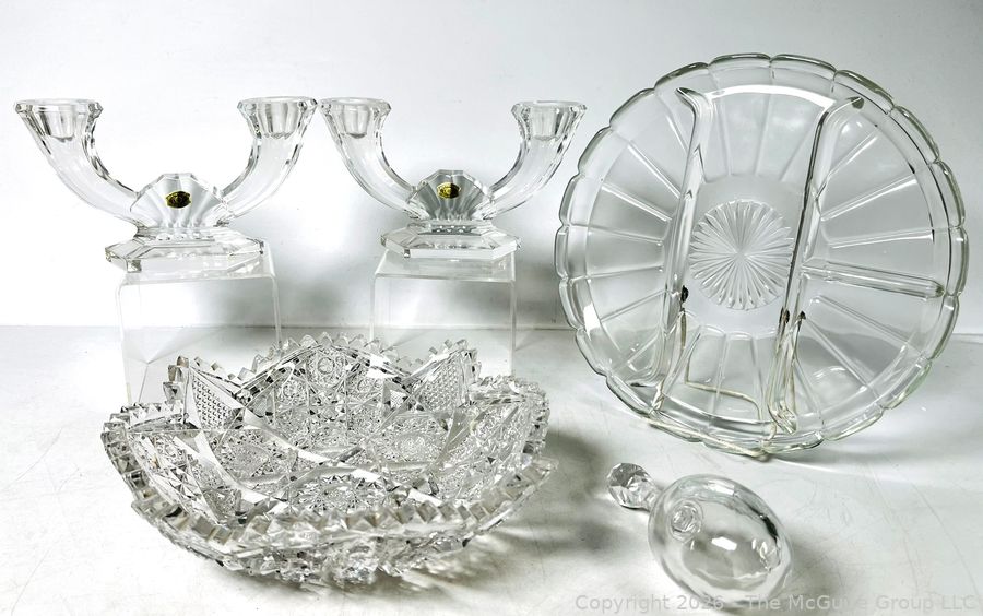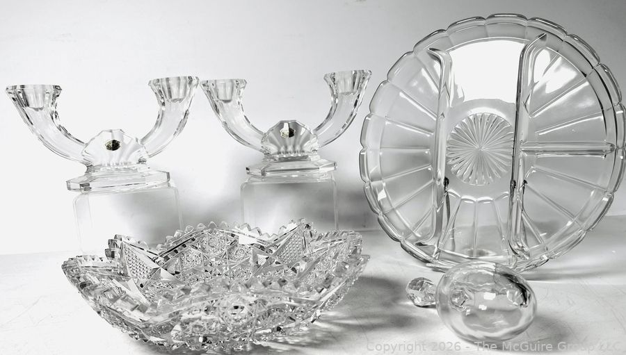 Lot #0138MB: Group of Clear Crystal Glass Including Candle Sticks, Serving Platters, Sock Darner and Bowls