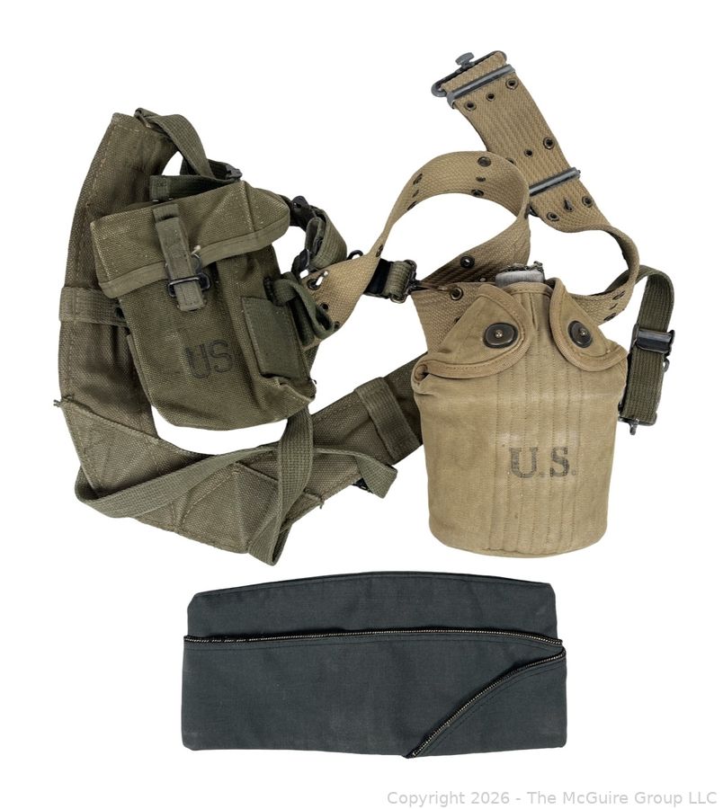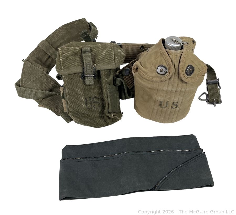 Lot #0186MB: Militaria: Ammunition Pouch, Canteen, Pistol Belt and Green Army Cap