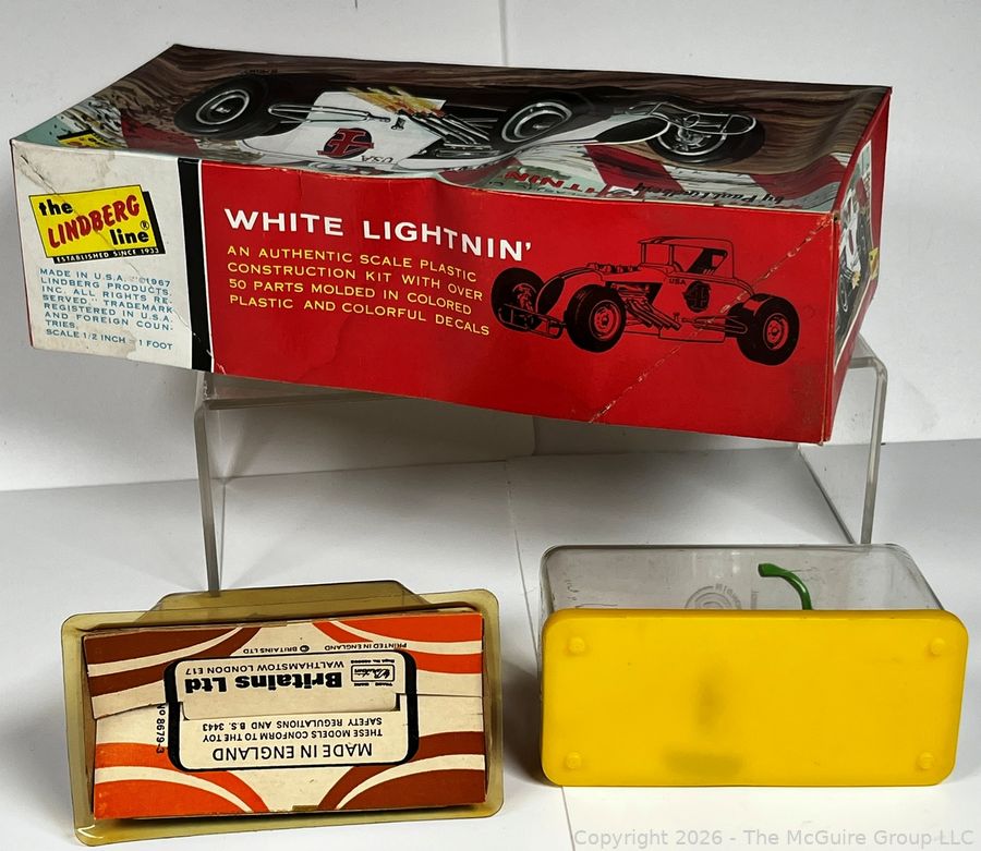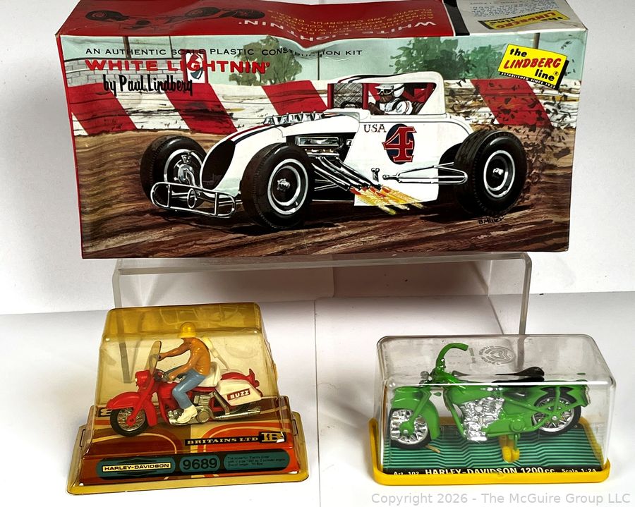 Lot #0141AFB: Two (2) Harley Davidson Motorcycle Toys and Lindberg 6030 White Lightnin Model Kit Vintage 1967