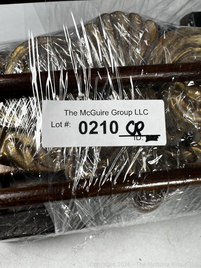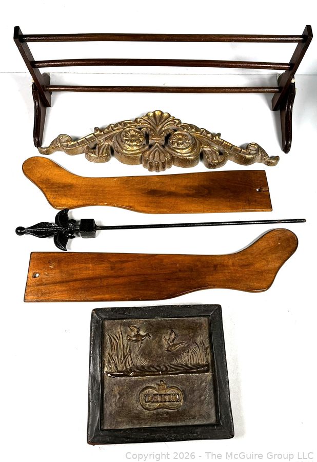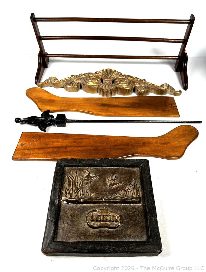 Lot #0210CP: Wood Stocking Forms, Framed Tile, Cast Iron Poker and Wall Mount Wood Rack