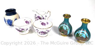 | 0362LC | ![]() | Studio Made Vase, Cloisonne Vases and Aynsley Violette Porcelain Cups and Creamer | $4.00 | 4890 | 5 days, 20 hours, 45 minutes |