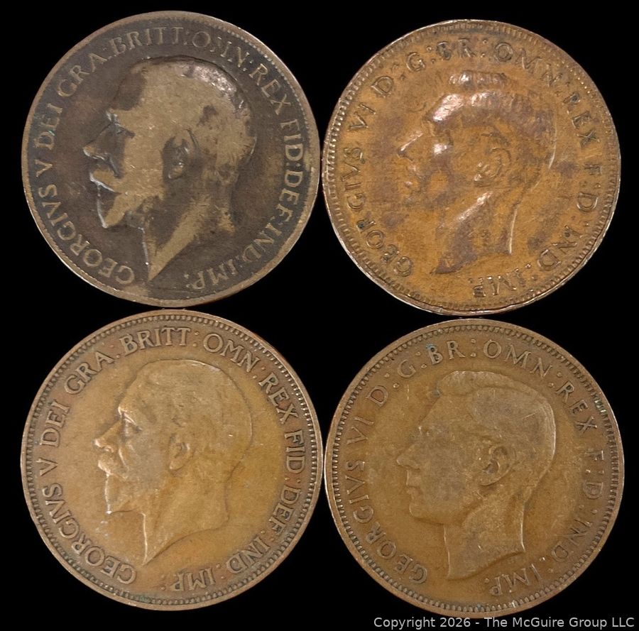 Lot #0461LC: Four (3) British One Penny Coins 1913 1936 1938, and 1917 Australian Penny