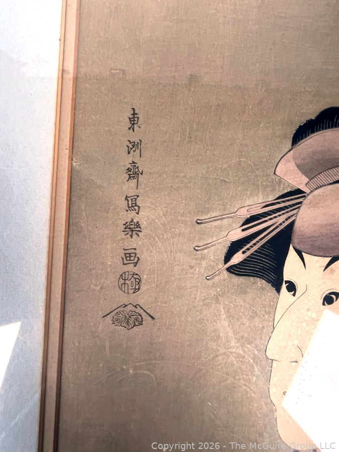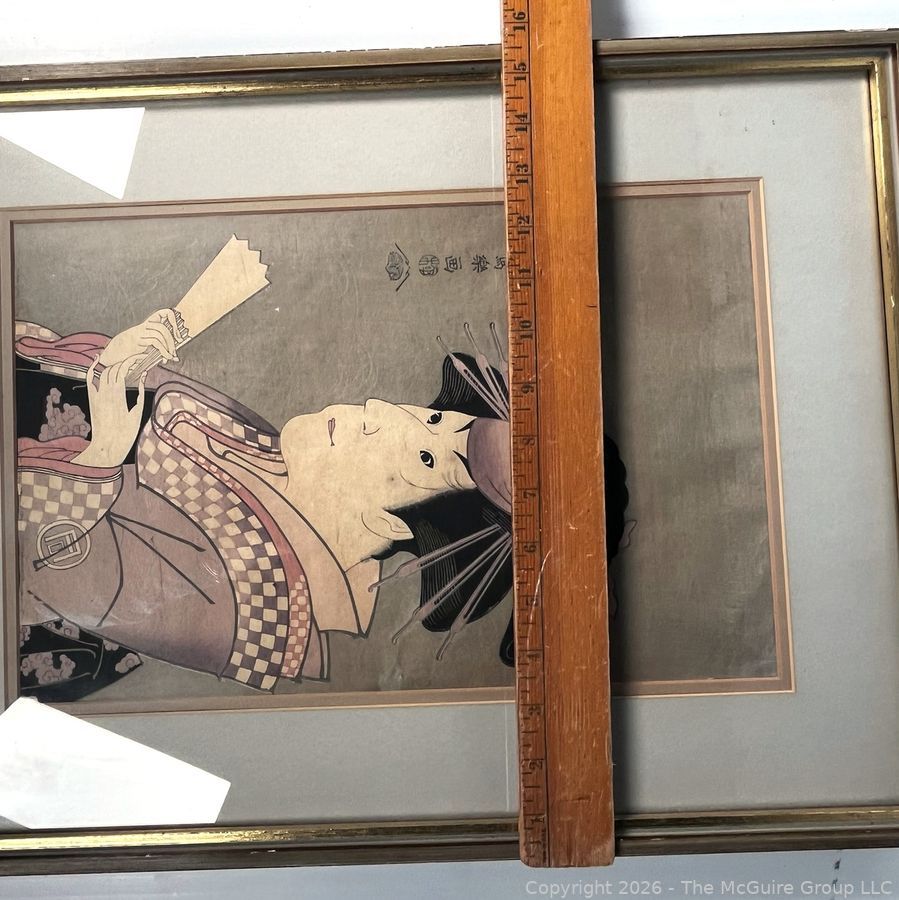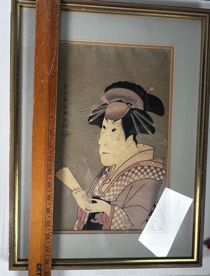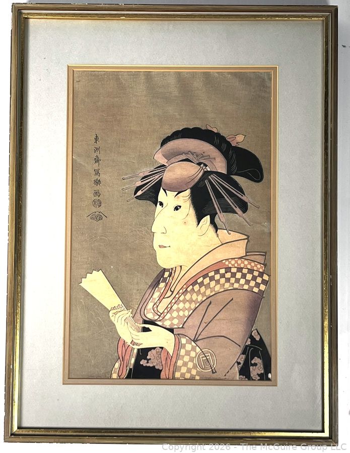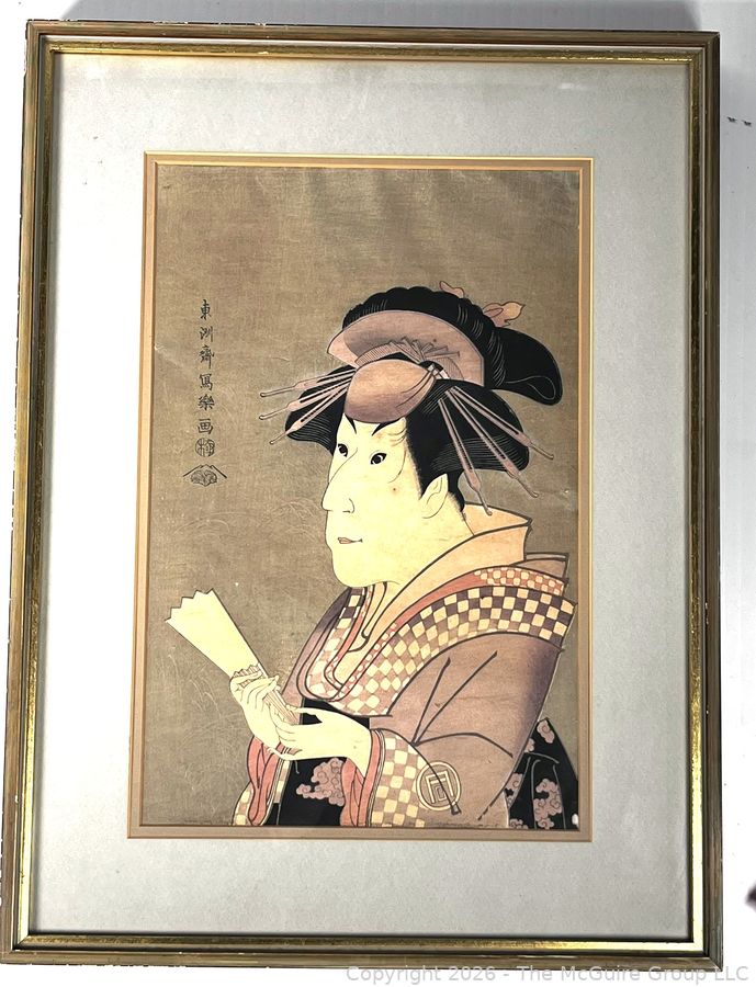 Lot #1008PB: Framed Under Glass Actor Wood Block Print of Ichimatsu III as Shirabito Onayo of Gion by Tōshūsai Sharaku, Japan. 15" x 20".