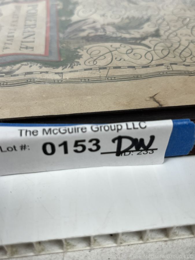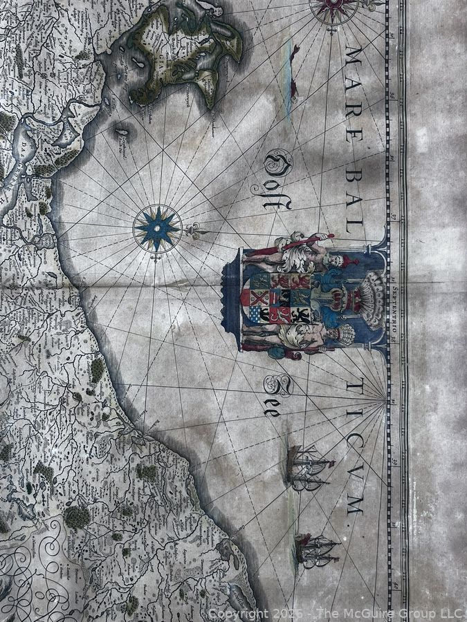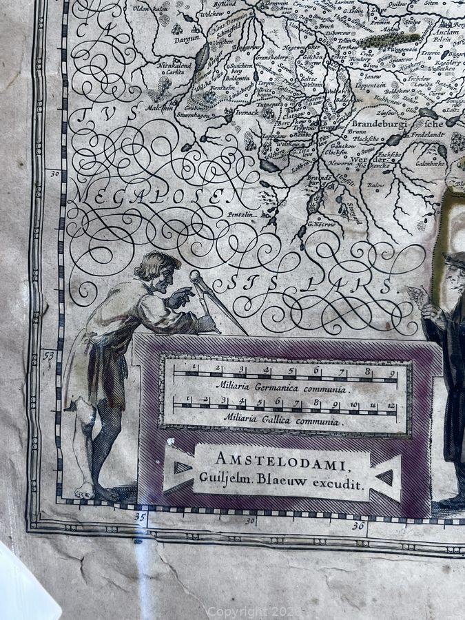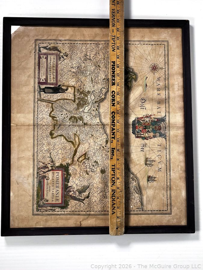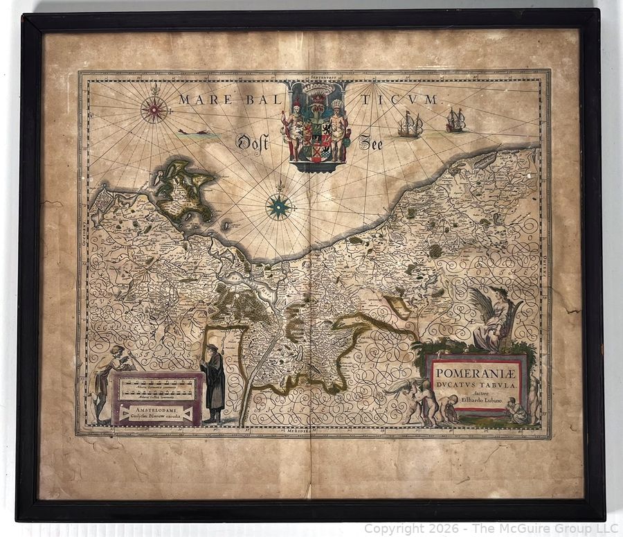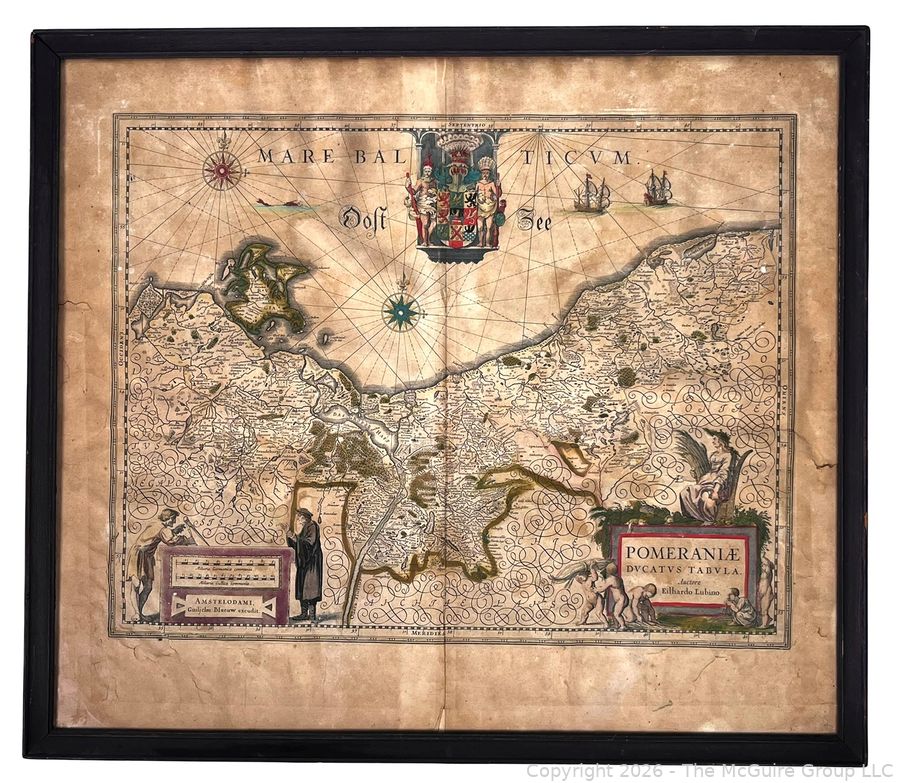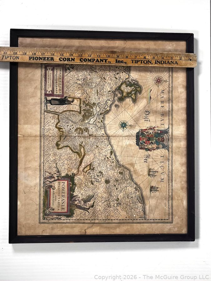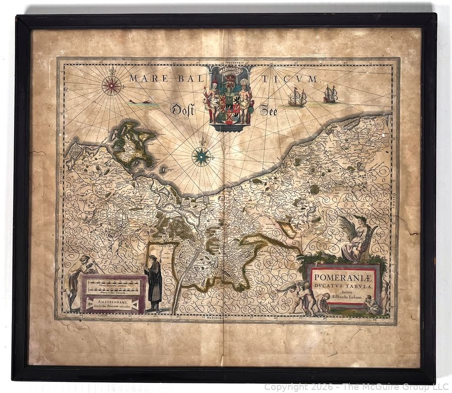 Lot #0153DW: Framed Under Glass Historica Map Titled Pomeraniae Ducatus Tabula by by Willem Janszoon Blaeu in 1630, with contributions from Eilhardo Lubino. 21" x 23"