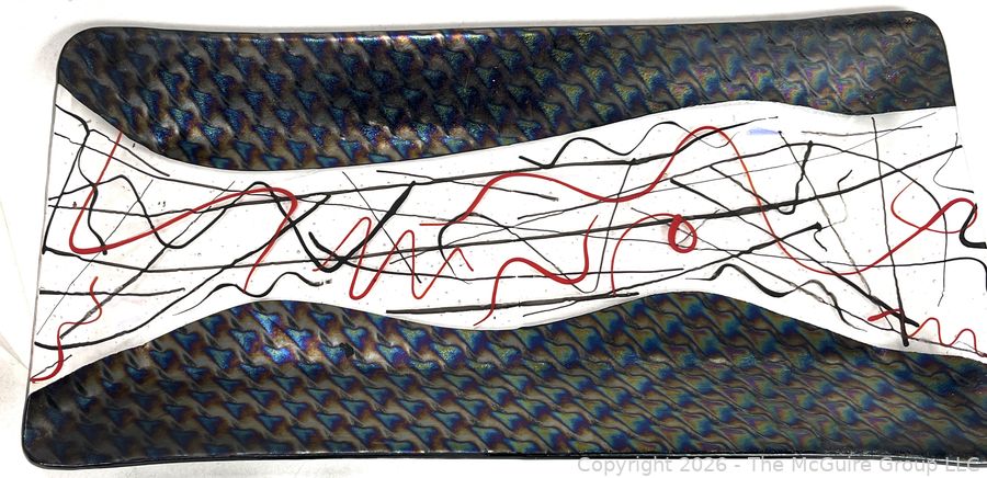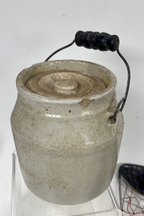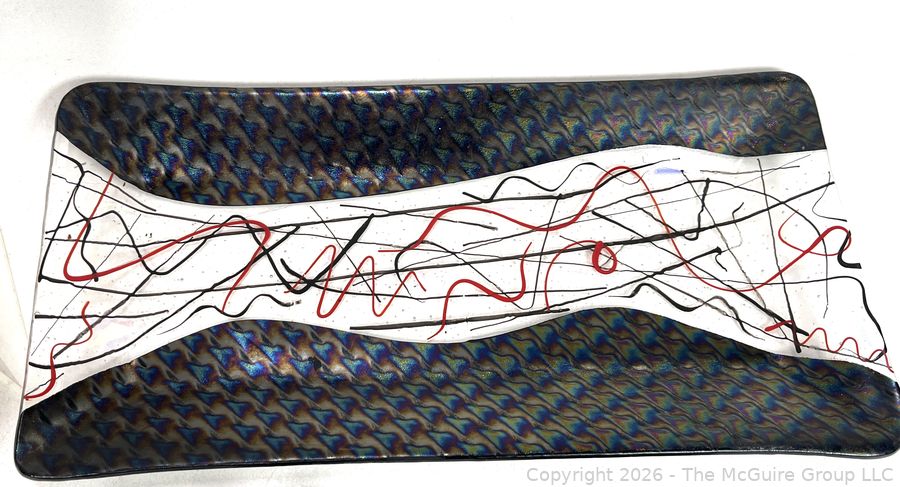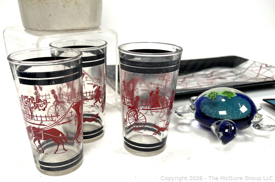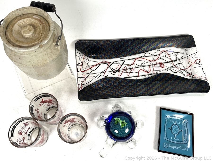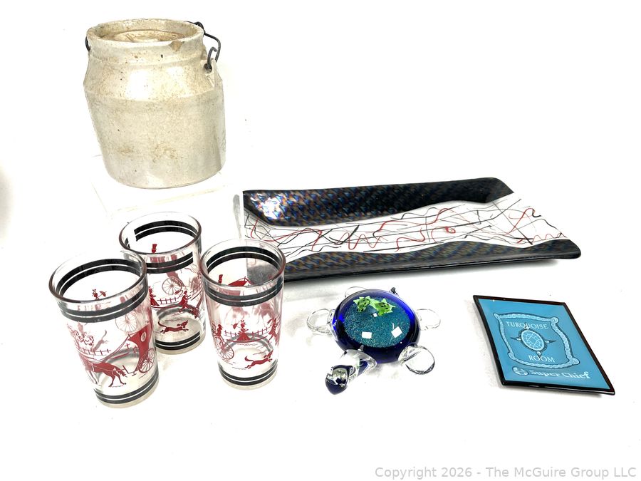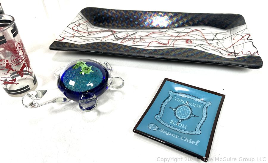 Lot #0317LC: Grouping of Art Glass Trays, Turtle, Covered Crock with Wooden Handle and Mid-Century Glassware
