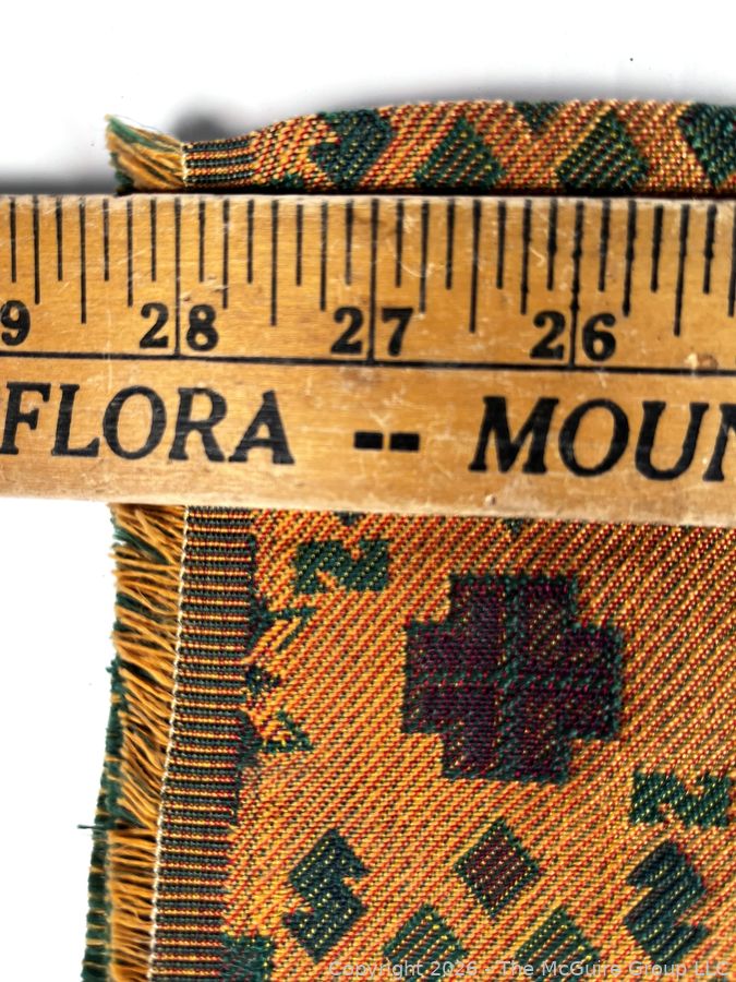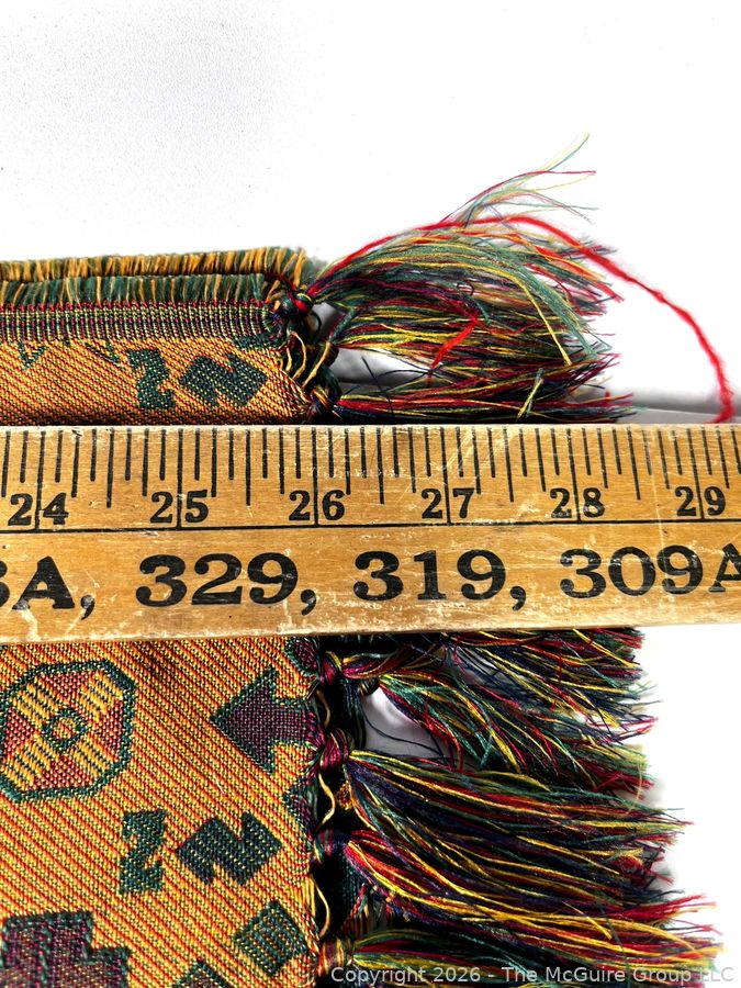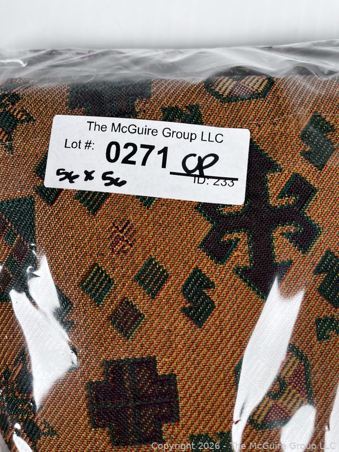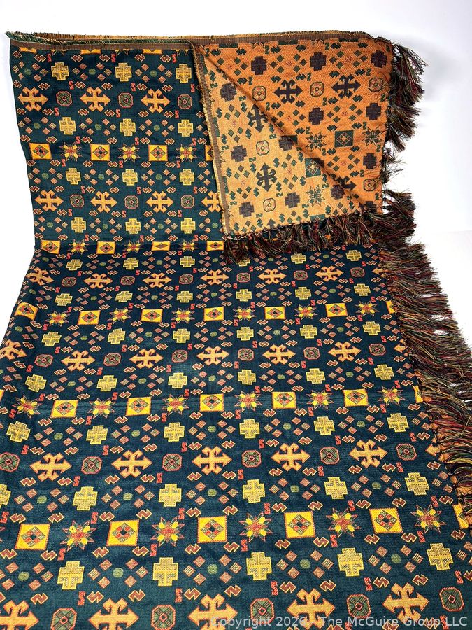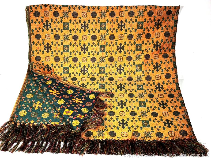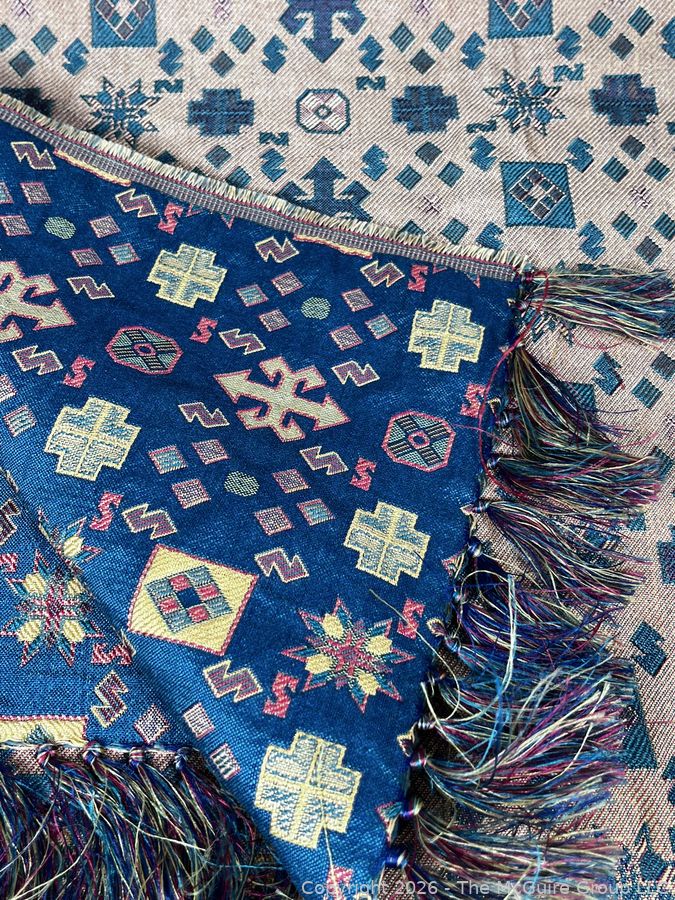 Lot #0271CP: Victorian Heavy Woven Reversible Tapestry Teal and Gold Geometric Fabric Shawl or Throw. 56" x 56".